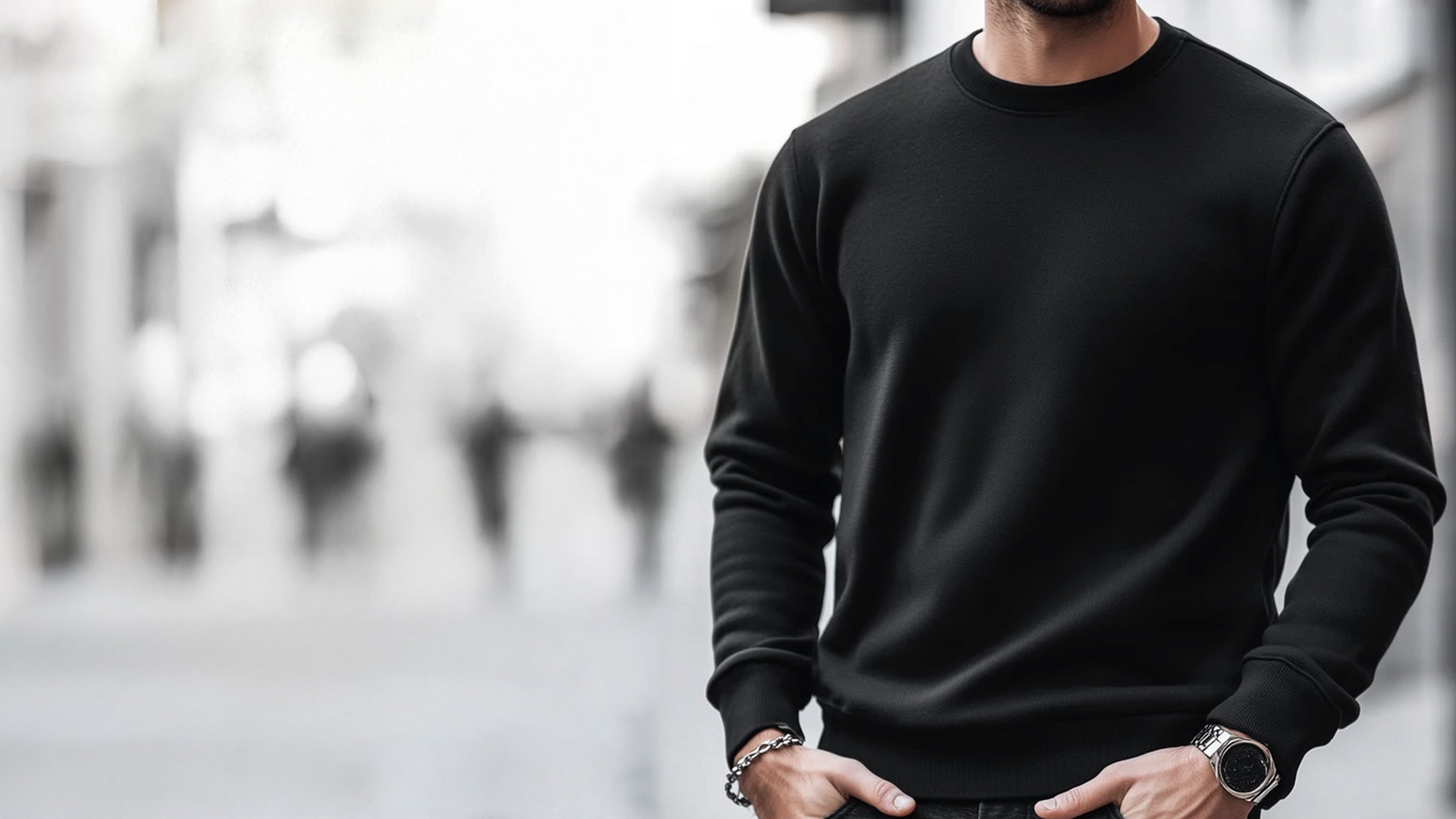 Basic Round Black Sweatshirt with Leather Sleeves - Essentials wks608